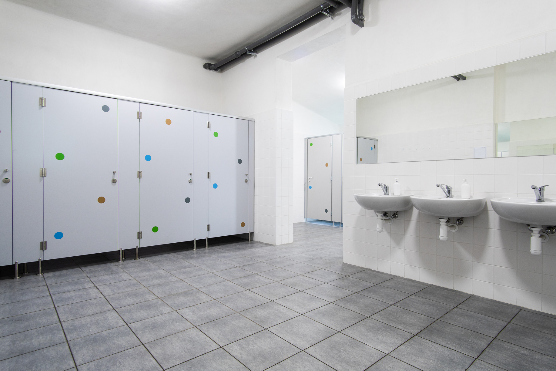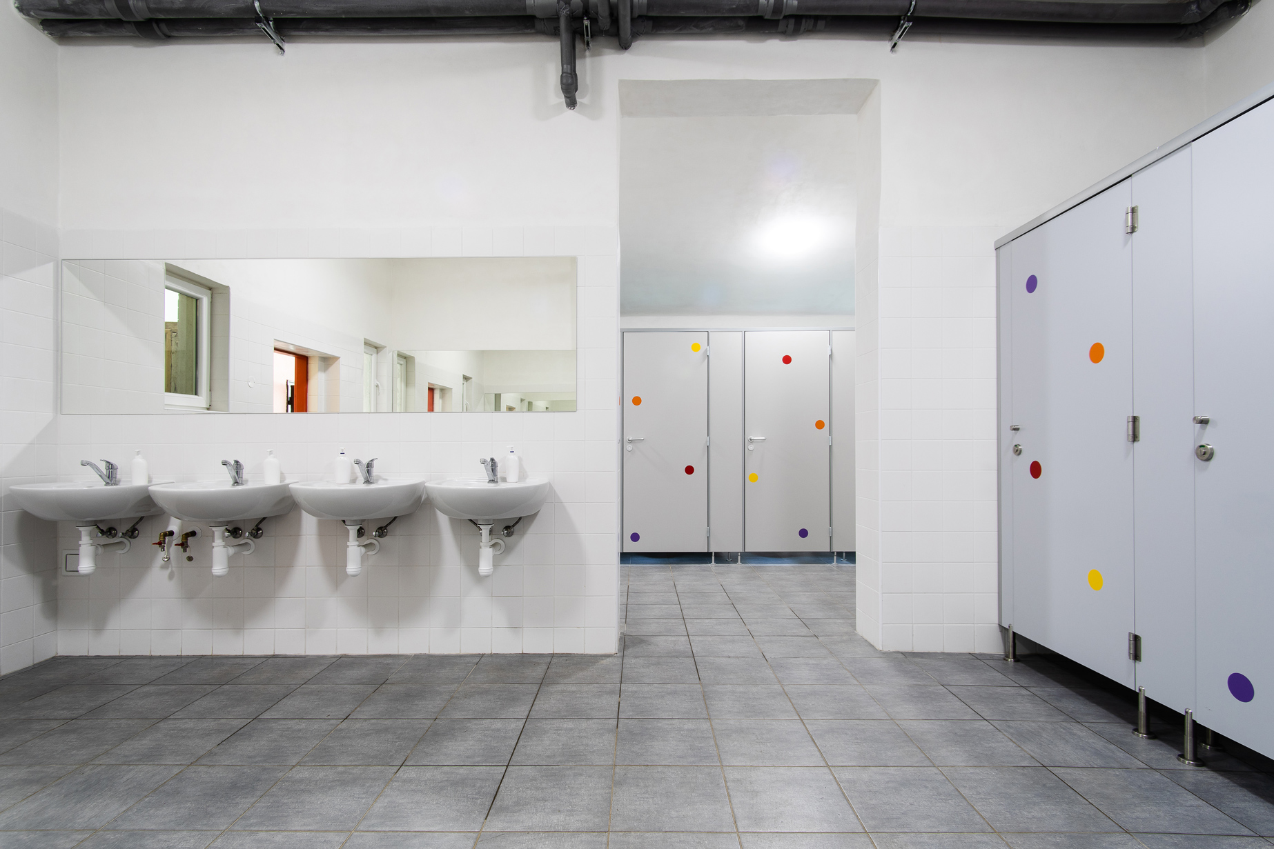 Ve zděné budově v blízkosti všech ubytovacích kapacit. V umyvárnách a sprchách je po celý den teplá voda.
