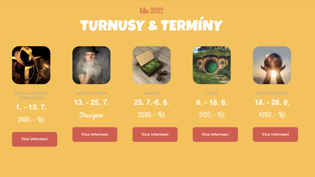 Přípravy na dětské tábory 2022 jsou tu! Máme zveřejněné jednotlivé běhy a k nim celotáborové hry. Můžete se těšit na Indianu Jonese, Harryho Pottera, Jumanji, Hobita. Nově přidáváme pátý turnus – Poslední misi. Děti se mohou zase těšit na skvělou zábavu, krásnou přírodu, bezva partu…