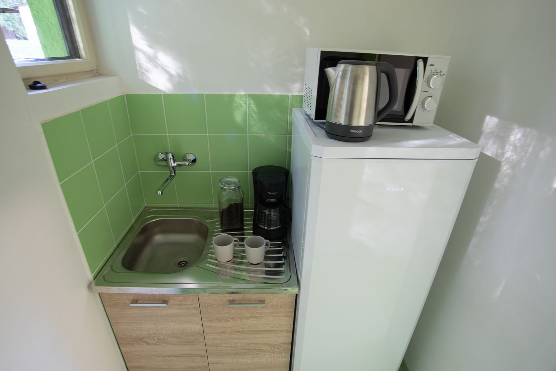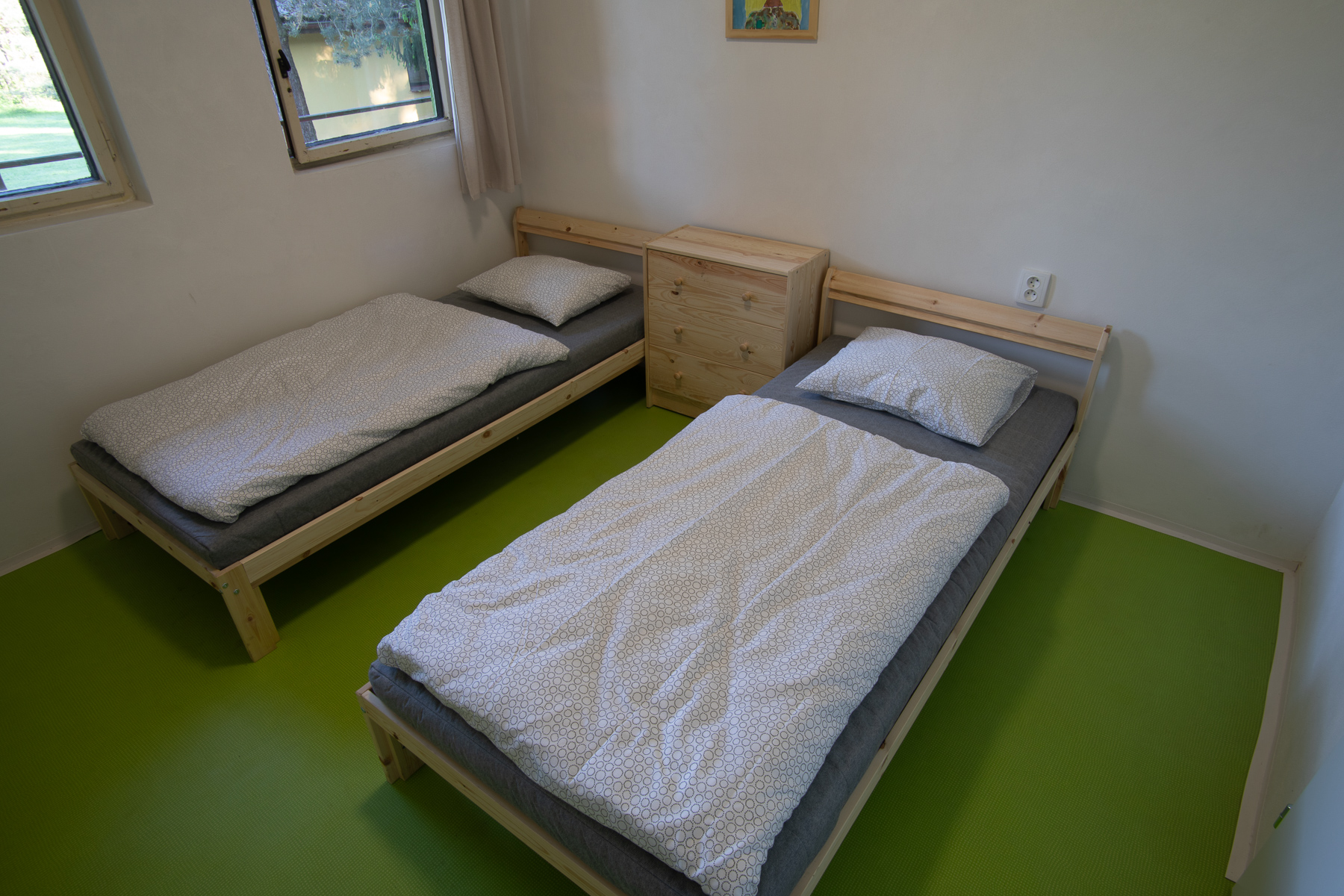 Zelený domek má celkovou kapacitu 28 lůžek. V roce 2019 byl kompletně rekonstruován. Každý pokoj má vlastní sociální zařízení. V levé části je kuchyňka s lednicí, mikrovlnkou, konvicí a dřezem.
