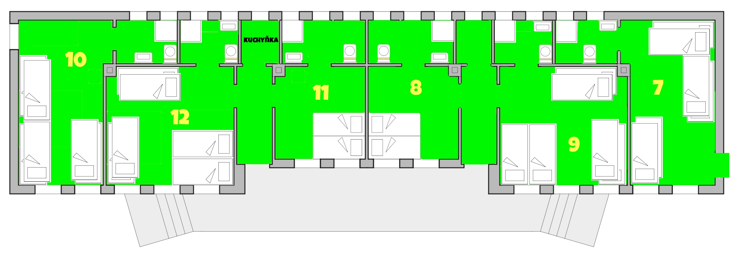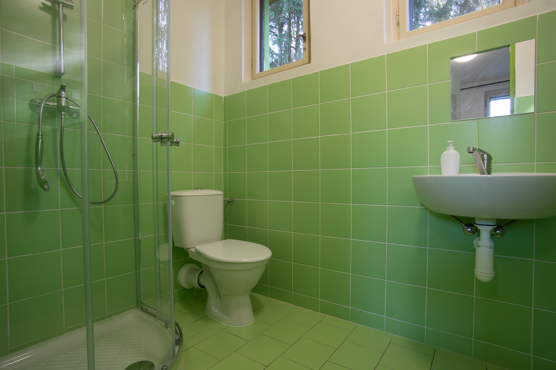 - Pokoj č. 12 – 6 lůžek – vlastní koupelna s toaletou, umyvadlem a sprchou