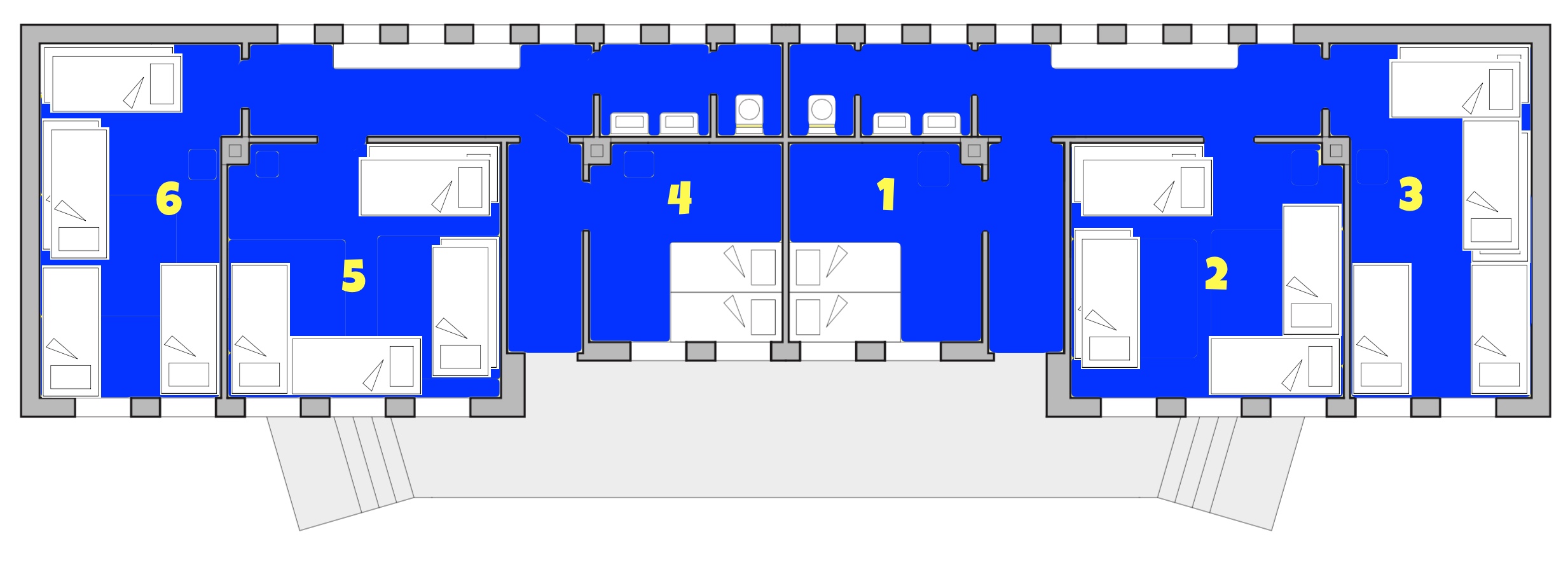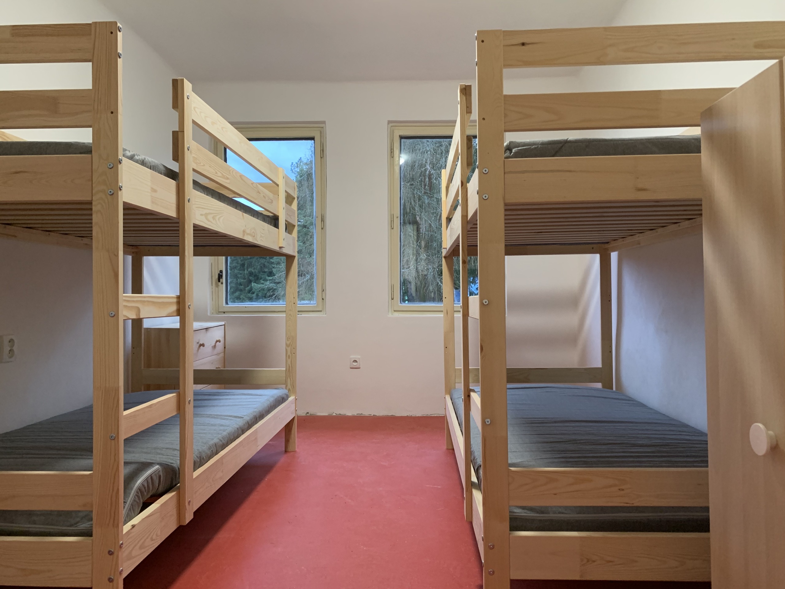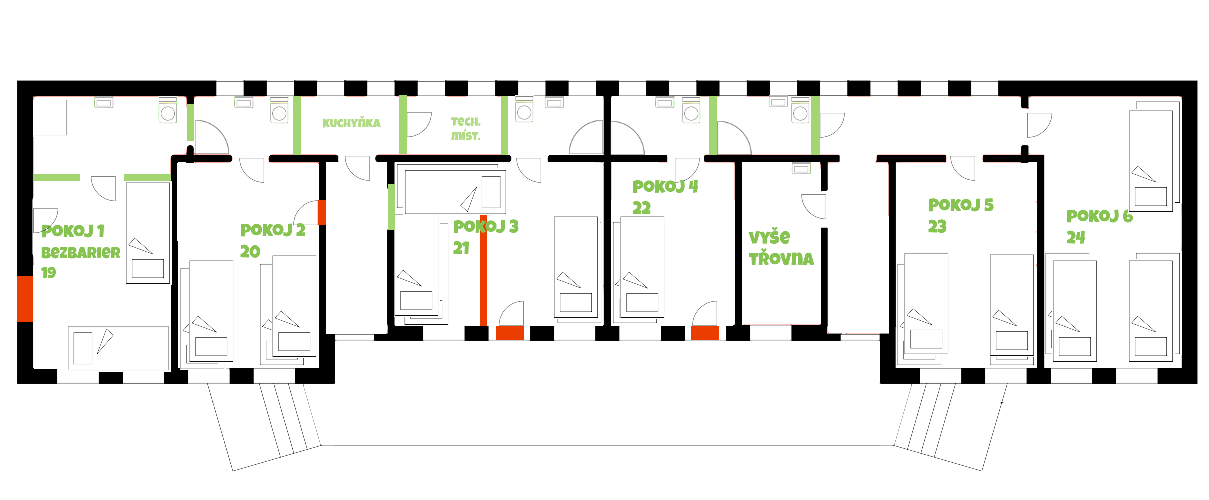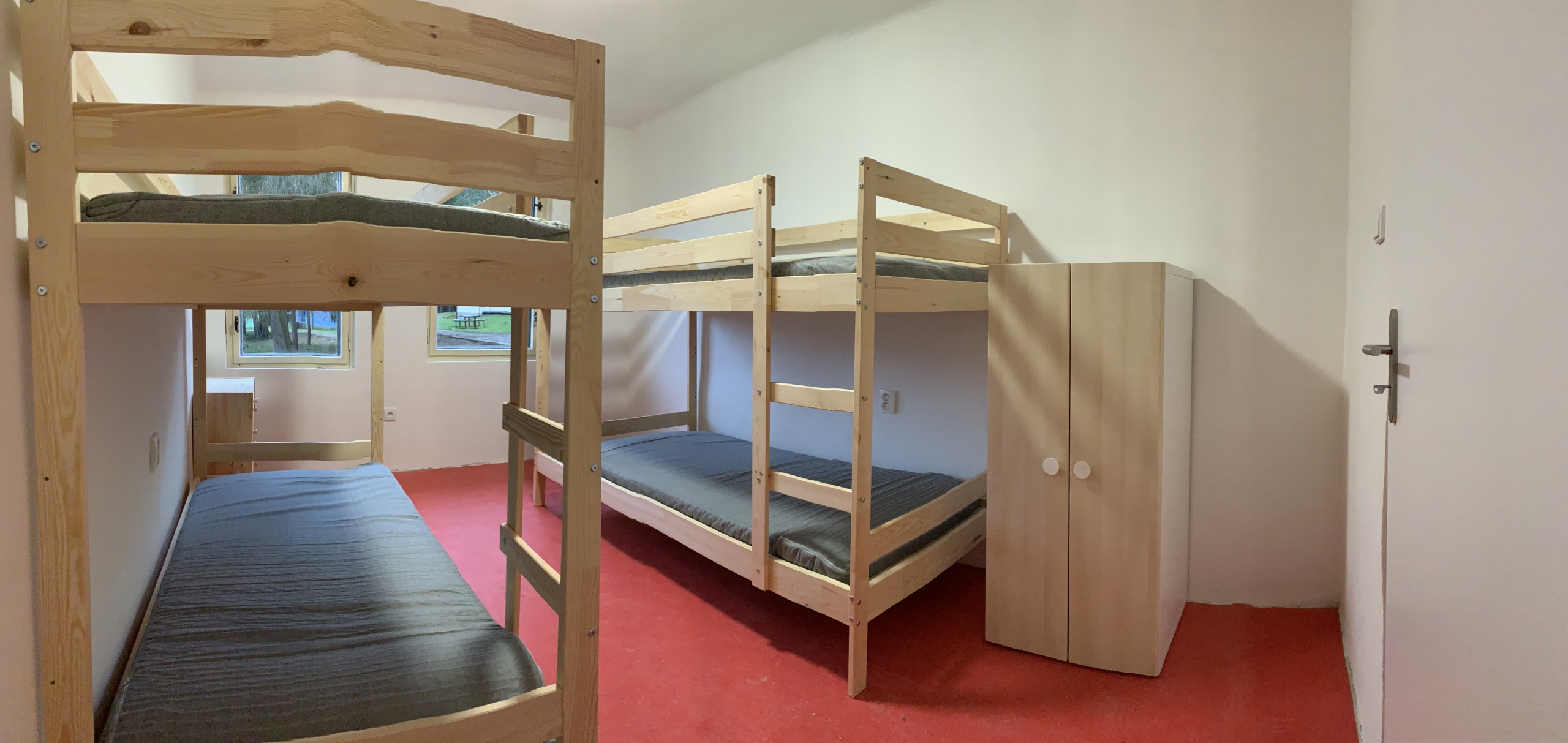 - Pokoj č. 24 – 6 lůžek – koupelna s toaletou, umyvadlem a sprchou na chodbě